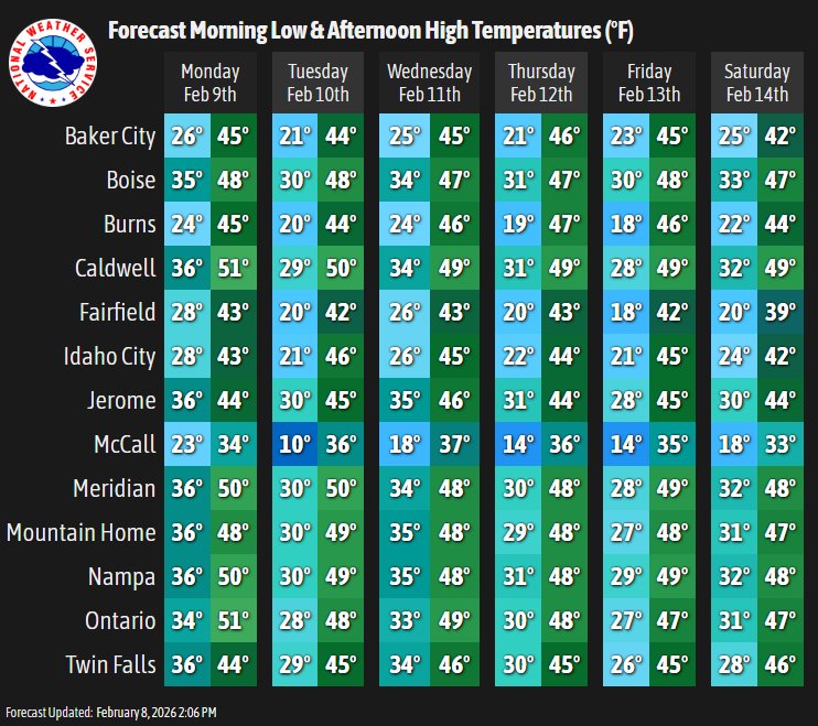Forecast predicts varied temperatures and rainy weather across Idaho and Oregon.