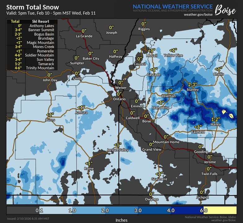 The National Weather Service in Boise, Idaho, said the forecast calls for light rain in the lower valleys and light snow in the mountains from 5 p.m. Tuesday, Feb. 10, to 5 p.m. Wednesday, Feb. 11, with ski resorts projected to see mostly light accumulations—from less than 1 inch at many locations to 3 inches at Magic Mountain and 2 inches at Stanley.